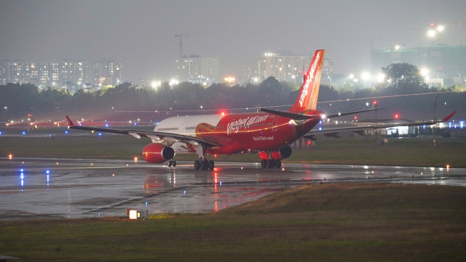 hình ảnh máy bay Vietjet cất cánh ban đêm