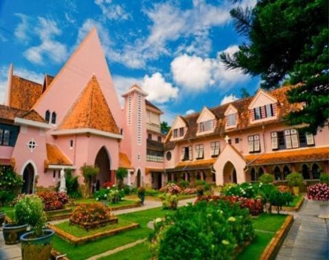 Sau đó, đoàn tiếp tục tham quan nhà thờ Domain De Marie - Ngôi thánh đường màu hồng xinh đẹp nằm trên đồi Mai Anh, mang nét kiến trúc phương Tây pha trộn nét Việt Nam cổ kính.