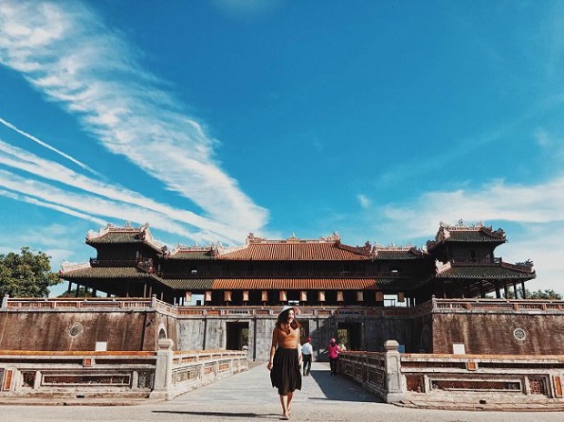 - Chiều:Tham quan Đại Nội (Hoàng Cung của 13 vị vua triều Nguyễn, triều đại phong kiến cuối cùng của Việt Nam: Ngọ Môn, Điện Thái Hoà, Tử Cấm Thành, Thế Miếu, Hiển Lâm Các, Cửu Đỉnh) và Chùa Thiên Mụ cổ kính, xây dựng từ những năm đầu của thế kỉ XVII
