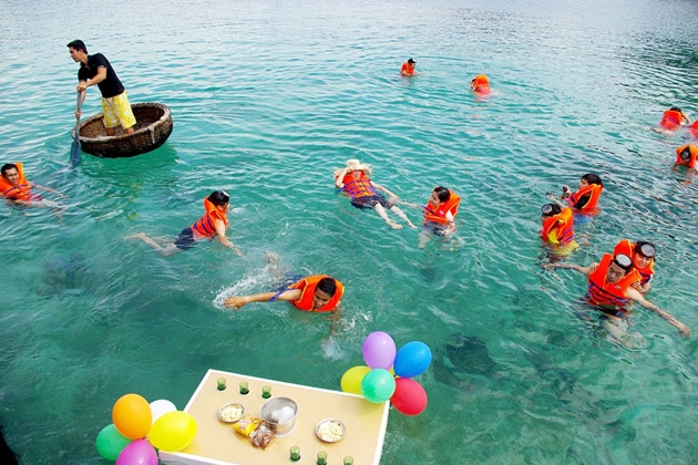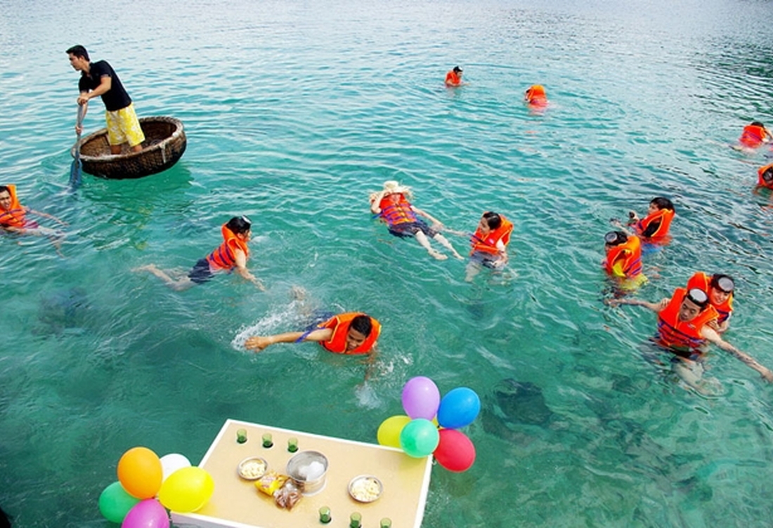 15h00: Di chuyển ra Bãi Nhà Cũ để tắm biển và lên Thuyền Thúng ra bãi San Hô. Tại đây, quý khách sẽ được trang bị Kính Lặn và Áo Phao để tung tăng hòa mình vào làn nước biển trong xanh và ngắm nhìn những rặng san hô muôn màu sắc. Không những vậy, tại đây Quý khách còn được chụp hình thoải thích, lưu lại những kỉ niệm trong chuyến đi đầy ý nghĩa.