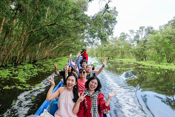 Tiếp tục hành trình đến rừng tràm Trà Sư – nơi thiên nhiên hoang sơ hiện ra với màu xanh ngút ngàn. Quý khách đi tắc ráng xuyên rừng, ngắm bèo phủ kín mặt nước, tận hưởng không khí trong lành và yên bình.